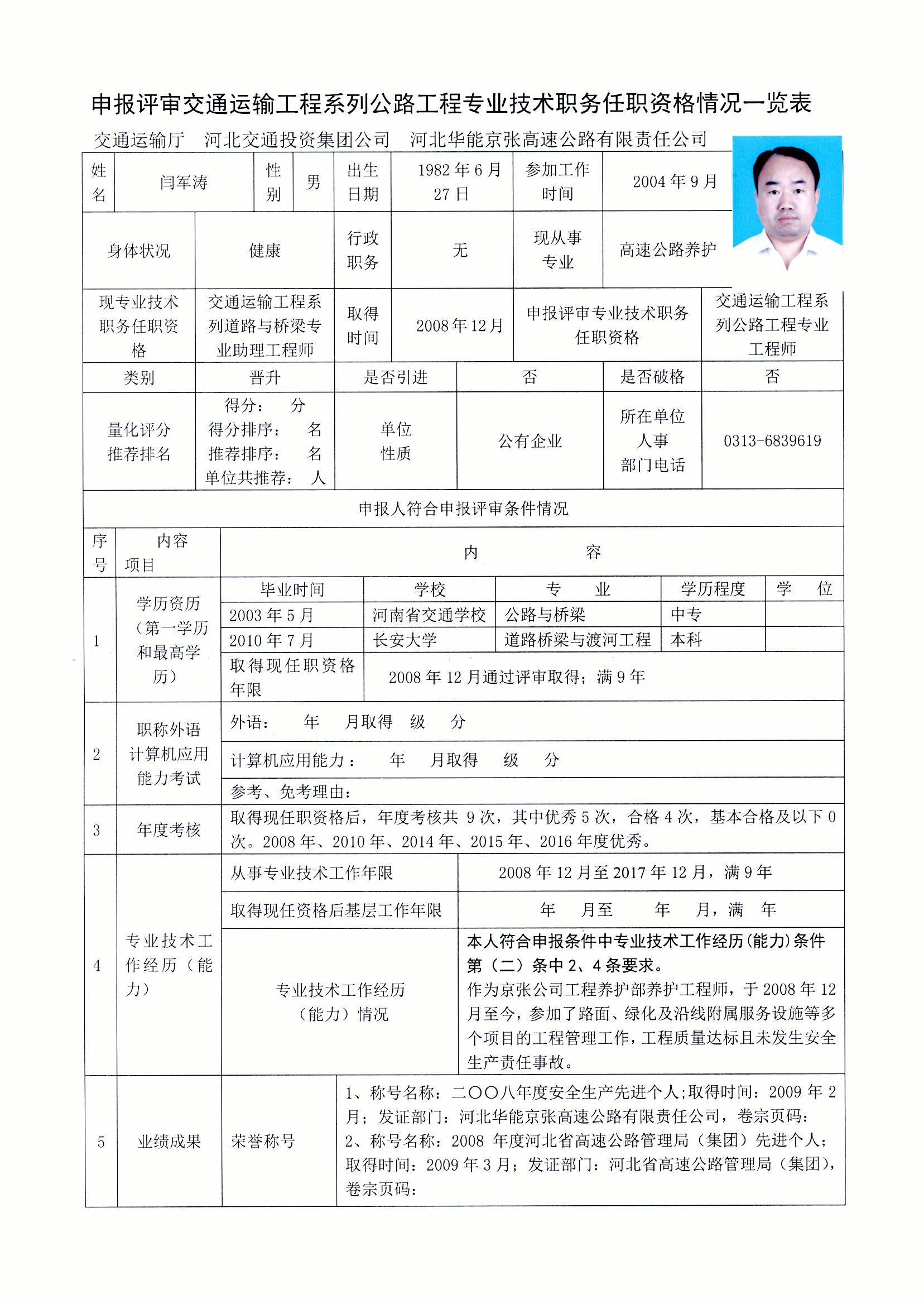 京張公司2017年度專業(yè)技術(shù)職稱申報(bào)公示(閆軍濤)