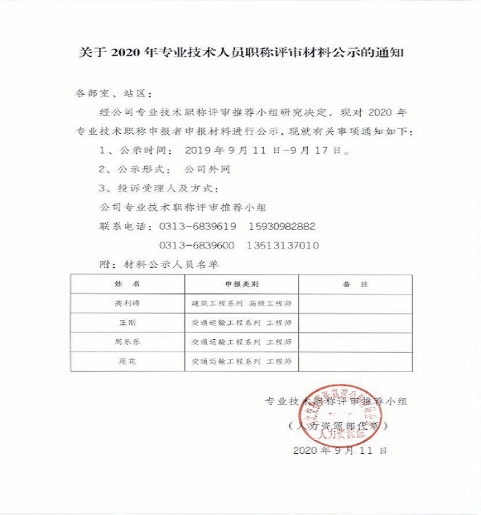 關(guān)于2020年專(zhuān)業(yè)技術(shù)人員職稱(chēng)評(píng)審材料公示的通知