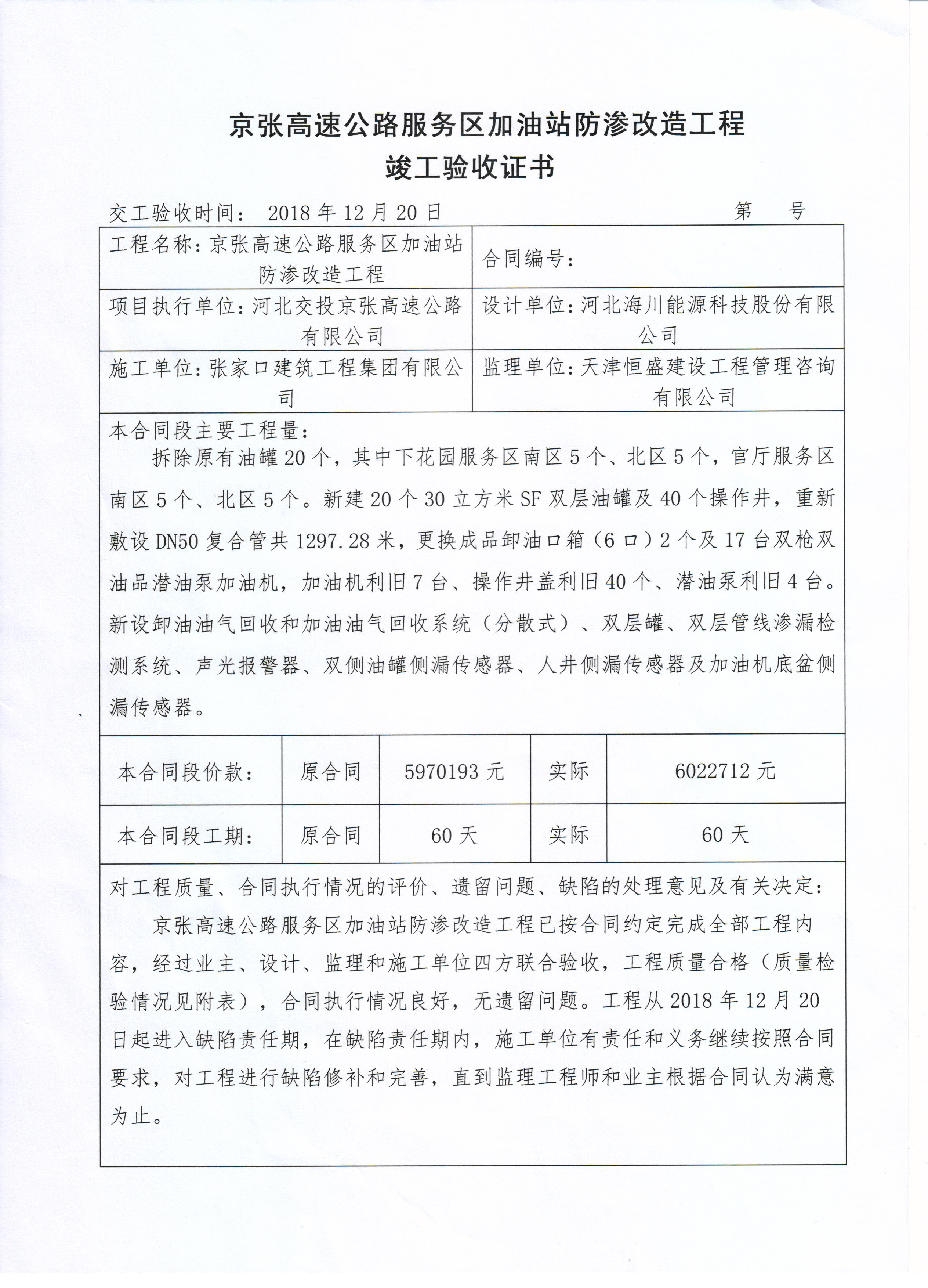 京張高速公路服務(wù)區(qū)加油站防滲改造工程竣工驗(yàn)收證書(shū)