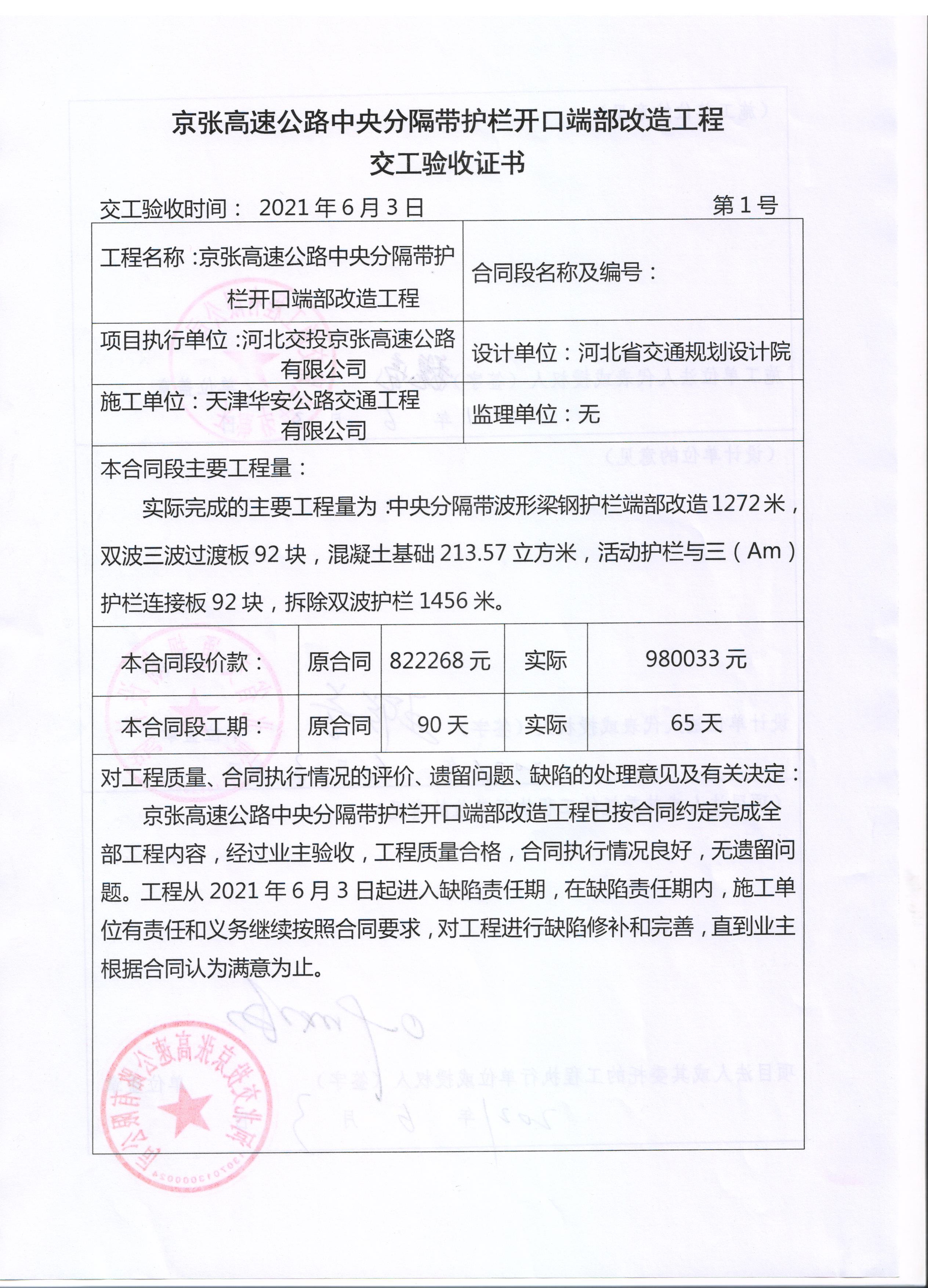 京張高速公路中央分隔帶護(hù)欄開口端部改造工程交工驗(yàn)收證書
